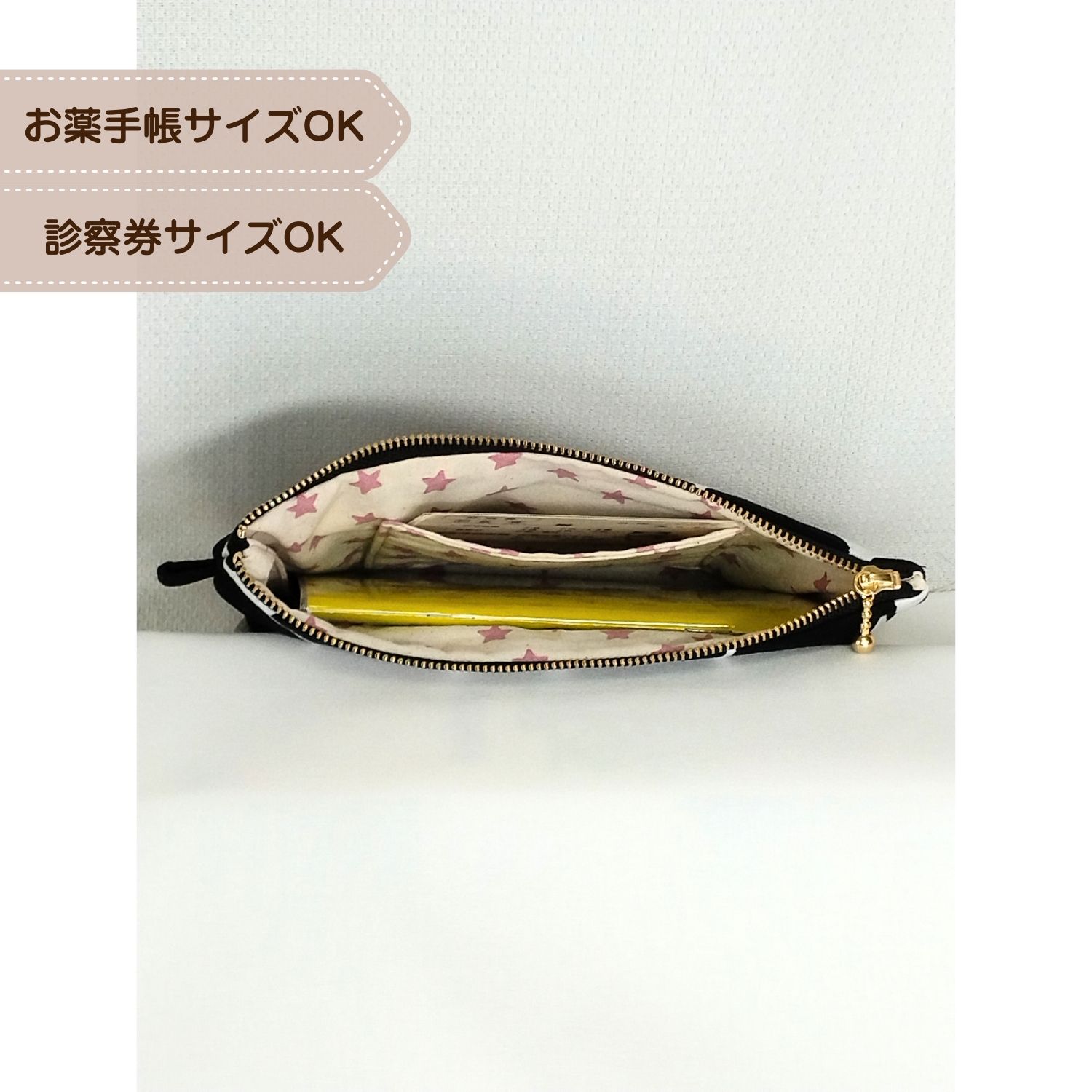お薬手帳や診察券、予備のマスク、通帳、ペンなどのステーショナリーグッズなど 使いやすい大きさです。